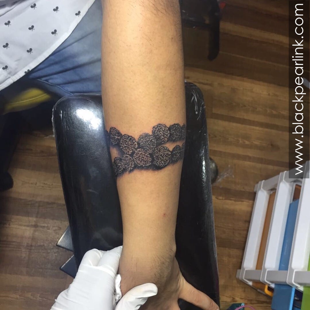 This is a forearm band tattoo. Band tattoos have always been among the most popular tattoo designs. Earlier band tattoos consisted of just Tribal or Maori designs but nowadays there are more experiments done around them. This one is based on a Rudraksha concept.