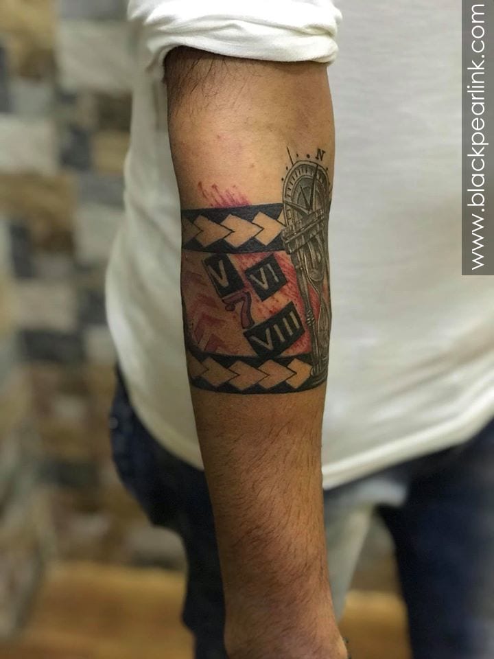 This is a forearm band tattoo. We at the Black Pearl Ink, specialize in customizing such theme based band tattoos. This one here is a nature inspired forearm band.